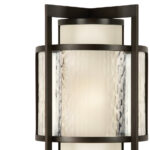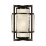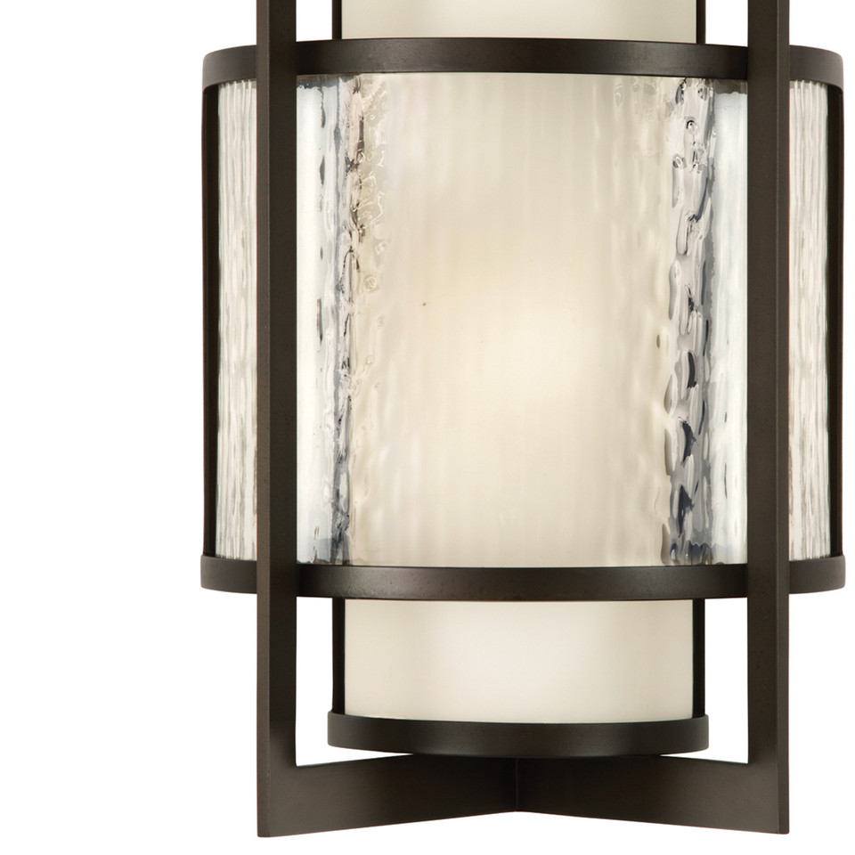 Outdoor aluminum sconce in dark bronze patina finish with off-white interior glass surrounded by a clear, textured outer glass.
